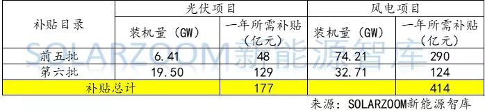 進(jìn)入前六批可再生能源補(bǔ)貼目錄的電站項(xiàng)目中,風(fēng)力發(fā)電項(xiàng)目和光伏發(fā)電項(xiàng)目裝機(jī)量占比超過(guò)95%,因此記者在可再生能源補(bǔ)貼測(cè)算中不涵蓋生物質(zhì)能和地?zé)崮艿妊a(bǔ)貼測(cè)算。經(jīng)測(cè)算,目前涵蓋在以發(fā)放的前六批可再生能源補(bǔ)貼目錄中,光伏項(xiàng)目每年所需要的補(bǔ)貼為177億元,風(fēng)電每年所需要的補(bǔ)貼為414億元。