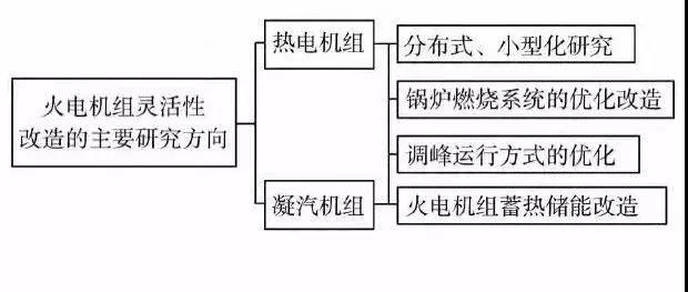 火電機組靈活性改造的研究方向:火電機組分為熱電機組和凝汽機組兩大類,歐美多數(shù)廣泛使用熱電聯(lián)產(chǎn)機組,但其中較大比重為大容量抽凝式機組;國內(nèi)兩類機組都普遍存在,熱電機組裝機容量大約為火電總裝機容量的32%。火電機組靈活性主要包括機組的調(diào)峰深度,爬坡能力和啟停速度等內(nèi)容,改造主要的研究方向如圖1所示。調(diào)峰運行方式的優(yōu)化和鍋爐燃燒系統(tǒng)的優(yōu)化改造是火電機組靈活性改造的主要手段。