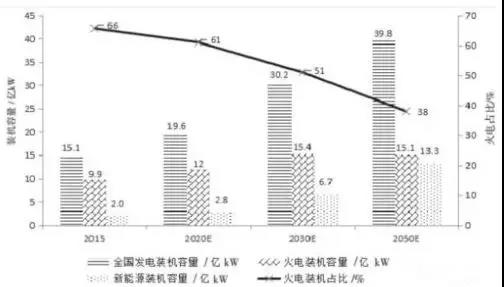 據(jù)中國電力企業(yè)聯(lián)合會預(yù)測, 2020年、2030年、2050年是我國火電產(chǎn)業(yè)發(fā)展的重要節(jié)點,未來我國火電產(chǎn)業(yè)將進入衰退期。2020年, 火電裝機容量占總裝機容量61%, 2030年下降到51%, 到2050年進一步下降至38%,而新能源裝機占比持續(xù)上升, 到2050年, 新能源裝機占比已上升至33%?;痣娧b機容量一路下行的數(shù)據(jù)拐點,無情地證明了火電產(chǎn)業(yè)規(guī)模逐年遞減。