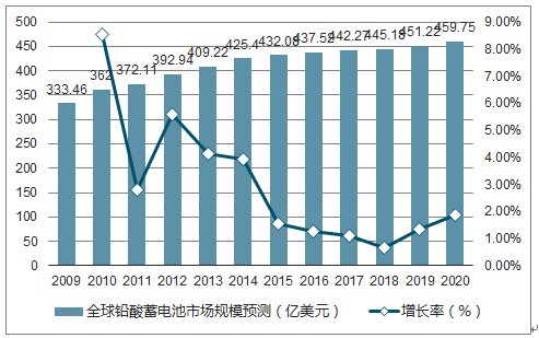 鉛酸蓄電池作為全球市場(chǎng)份額最大的電池類型, 全球市場(chǎng)規(guī)模預(yù)計(jì)仍將保持持續(xù)增長(zhǎng)。2015 年全球鉛酸蓄電池市場(chǎng)規(guī)模較上年增長(zhǎng) 1.57%,達(dá)到 432.08 億美元,預(yù)計(jì)未來 5 年將基本維持 1%-2%增長(zhǎng)速度。