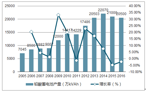 我國(guó)是全球最大的鉛酸蓄電池生產(chǎn)國(guó)、消費(fèi)國(guó)和出口大國(guó)。我國(guó)鉛酸蓄電池行業(yè)主要實(shí)行以銷定產(chǎn), 鉛酸蓄電池生產(chǎn)數(shù)量減去出口的數(shù)量大致為國(guó)內(nèi)消費(fèi)數(shù)量。從 2005 年至 2016 年,國(guó)內(nèi)企業(yè)鉛酸蓄電池產(chǎn)量呈波動(dòng)式增長(zhǎng),年均復(fù)合增長(zhǎng)率達(dá) 10.17%。