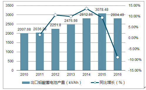 在“十三五”期間鉛酸蓄電池產(chǎn)量預(yù)計(jì)復(fù)合增長(zhǎng)率為 10.76%,至 2020 年鉛酸蓄電池產(chǎn)量達(dá)到 35,000 萬(wàn) kVAh。近年來,通過行業(yè)持續(xù)的技術(shù)引進(jìn)、消化、吸收和歐、美、日、韓等國(guó)家在我國(guó)的投資建廠,我國(guó)鉛酸蓄電池主要類產(chǎn)品的制造技術(shù)已經(jīng)接近國(guó)際先進(jìn)水平。目前,我國(guó)已成為全球鉛酸蓄電池生產(chǎn)、消費(fèi)和出口大國(guó)。近年來,我國(guó)出口鉛酸蓄電池產(chǎn)量保持較快速度增長(zhǎng),2015 年出口產(chǎn)量為 3,078.48 萬(wàn) kVAh,同比增長(zhǎng) 9.44%,2016 年出口產(chǎn)量下滑產(chǎn)量為 2,804.49 萬(wàn) kVAh,同比下降 8.90%。