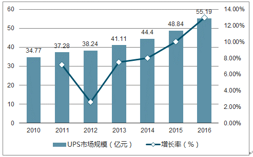 UPS 電源是 UninterruptablePowerSupply 的英文縮寫,即不間斷電源,作為一種具有儲(chǔ)能裝置的電子交流變換系統(tǒng),其基本功能是在中斷供電時(shí),能不間斷供電,始終向負(fù)載提供高質(zhì)量的交流電源,達(dá)到穩(wěn)壓、穩(wěn)頻、抑制浪涌、尖峰、電噪音、補(bǔ)償電壓下陷、長(zhǎng)期低壓等因素干擾。UPS 電源系統(tǒng)按其應(yīng)用領(lǐng)域可分為信息設(shè)備用 UPS 電源系統(tǒng)和工業(yè)動(dòng)力用UPS 電源系統(tǒng)二個(gè)大類別。信息設(shè)備用 UPS 電源系統(tǒng)主要應(yīng)用于:信息產(chǎn)業(yè)、IT行業(yè)、交通、金融行業(yè)、航空航天工業(yè)等計(jì)算機(jī)信息系統(tǒng)、通訊系統(tǒng)、數(shù)據(jù)網(wǎng)絡(luò)中心等的安全保護(hù)問題,其作為計(jì)算機(jī)信息系統(tǒng)、通訊系統(tǒng)、數(shù)據(jù)網(wǎng)絡(luò)中心等的重要外設(shè),在保護(hù)計(jì)算機(jī)數(shù)據(jù)、保證電網(wǎng)電壓和頻率的穩(wěn)定,改進(jìn)電網(wǎng)質(zhì)量,防止瞬時(shí)停電和事故停電對(duì)用戶造成的危害起到重要的作用。 工業(yè)動(dòng)力用 UPS 電源系統(tǒng)主要應(yīng)用于:工業(yè)動(dòng)力設(shè)備行業(yè)電力、鋼鐵、有色金屬、煤炭、石油化工、建筑、醫(yī)藥、汽車、食品、軍事等領(lǐng)域,其作為電力自動(dòng)化工業(yè)系統(tǒng)設(shè)備、遠(yuǎn)方執(zhí)行系統(tǒng)設(shè)備、高壓斷路器的分合閘、繼電保護(hù)、自動(dòng)裝置、信號(hào)裝置等的交、直流不間斷電源設(shè)備,質(zhì)量直接關(guān)系到電網(wǎng)的安全運(yùn)行,是發(fā)電設(shè)備和輸變電設(shè)備的“心臟”。2016 年我國(guó) UPS 市場(chǎng)規(guī)模預(yù)計(jì)為 55.19 億元,未來市場(chǎng)將保持較快的增長(zhǎng)速度。