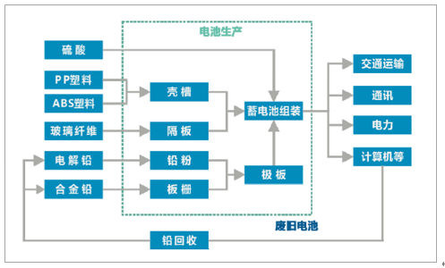 鉛酸蓄電池行業(yè)的上游行業(yè)主要是鉛冶煉和鉛貿(mào)易(大宗商品代理商),下游行業(yè)則包括交通運(yùn)輸、通訊、電力、計(jì)算機(jī)、科研等領(lǐng)域。隨著鉛酸蓄電池回收體系的建立和完善,鉛酸蓄電池產(chǎn)業(yè)鏈將形成良性的“資源-產(chǎn)品-再生資源”的閉環(huán)結(jié)構(gòu),有望成為資源節(jié)約型的循環(huán)發(fā)展產(chǎn)業(yè)。
