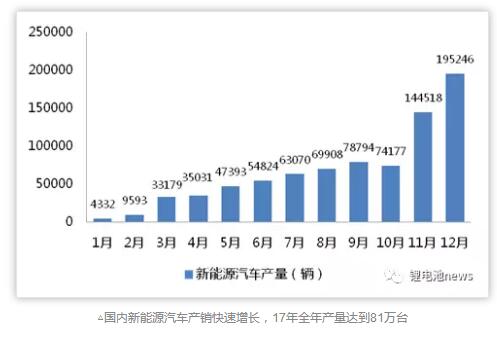 隨著新能源汽車推薦目錄的月度更新成為常態(tài),行業(yè)重回正軌;根據(jù)節(jié)能與新能源汽車網(wǎng)數(shù)據(jù)我國2017年新能源汽車產(chǎn)量達(dá)到81萬臺,同比增長接近60%;其中12月單月產(chǎn)量達(dá)到19.5萬臺,創(chuàng)歷史新高。