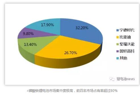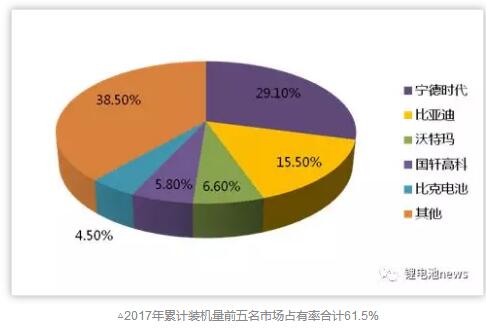 根據(jù)數(shù)據(jù)顯示,我國動力電池2016年出貨量28.04GWh,市場前五名份額占有率累計達(dá)到72.6%;根據(jù)高工鋰電數(shù)據(jù)顯示,我國2017年動力電池裝機(jī)量約為36.39GWh,其中前五名市場占有率下降為61.5%。