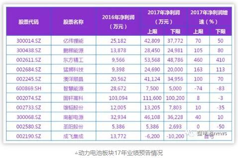 因此2017年動力電池領(lǐng)域,綁定龍頭企業(yè)寧德時代的PACK企業(yè)東方精工(增長410%-460%)、發(fā)力三元的動力電池新進(jìn)入者億緯鋰能(增長50%-70%)、鵬輝能源(增長80%-105%)等企業(yè)均取得較快的業(yè)績增速。
