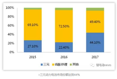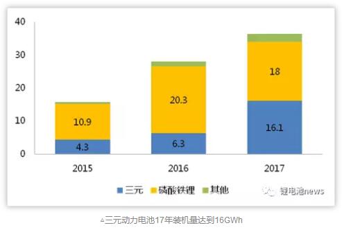 根據(jù)節(jié)能與新能源汽車網(wǎng)合格證數(shù)據(jù)顯示,我國2017年動力電池裝機(jī)量約為36.39GWh,其中三元動力電池裝機(jī)量16.05GWh,同比增長155%;占比達(dá)到44%,市場占有率實現(xiàn)翻倍增長。