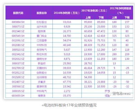 鋰電池材料領(lǐng)域共17家企業(yè)發(fā)布17年業(yè)績預(yù)告,其中12家預(yù)增(8家增速超過100%),2家預(yù)減,3家與16年基本持平。