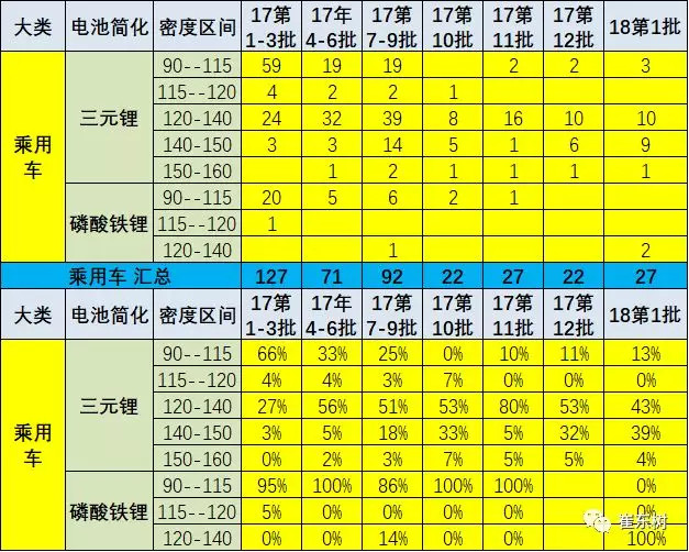 以上為純電動(dòng)且非快充的電池的特征。2018年純電乘用車的能量密度的提升也是較快,但2018年第1批乘用車車高于120的占到90%,140-150瓦的純電三元電池的達(dá)到9款。低能量密度的電池有所回升。而且本批的磷酸鐵鋰電池的車型也有出現(xiàn),能量密度表現(xiàn)120 ,也是能拿到正常補(bǔ)貼的。