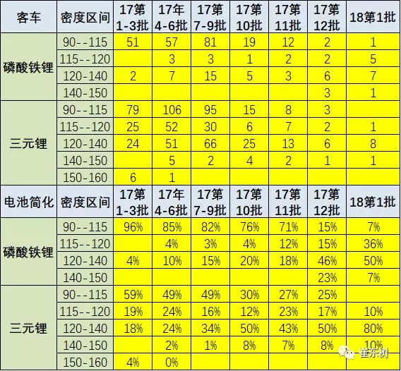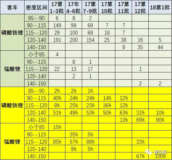 2018年客車電池提升很快,磷酸鐵鋰的占比保持90%以上,第1批磷酸鐵鋰的電池的能量密度達(dá)到120以下為0%.而錳酸鋰也是基本都是高于140。由于客車的競(jìng)爭(zhēng)相對(duì)充分,大部分客車企業(yè)都能實(shí)現(xiàn)120的補(bǔ)貼鼓勵(lì)要求??蛙嚹壳爸饕N著補(bǔ)貼推動(dòng),但高于140瓦/千克的新品也是已經(jīng)成為新品主流。