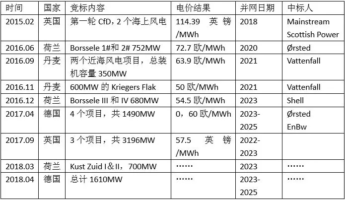 本號1月3日發(fā)布的文章【市場】2017大盤點之——歐洲海上風電競標介紹了2017年歐洲海上風電競標情況。下面我們按照時間順序,重新梳理一下歐洲各國近幾年海上風電電價競標結(jié)果。