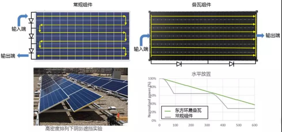 (2)高發(fā)電量。疊瓦組件無(wú)焊帶與疊瓦電池連接設(shè)計(jì),保證了充裕的電流通路,也減少了組件功率衰減,在同等生命周期性下較常規(guī)組件提升更多發(fā)電量。值得一提的是,使用全并聯(lián)電路設(shè)計(jì)的疊瓦組件功率下降與陰影遮蔽面積呈線性關(guān)系,與其它常規(guī)組件相比,在陰影遮擋的條件下表現(xiàn)更好,更適合高緯度地區(qū)、土地集約項(xiàng)目,以及分布式項(xiàng)目等。