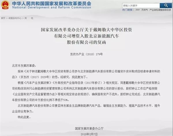 中國(guó)儲(chǔ)能網(wǎng)訊:近日,國(guó)家發(fā)改委發(fā)布了《關(guān)于戴姆勒大中華區(qū)投資有限公司增資入股北京新能源汽車(chē)股份有限公司的復(fù)函》。
