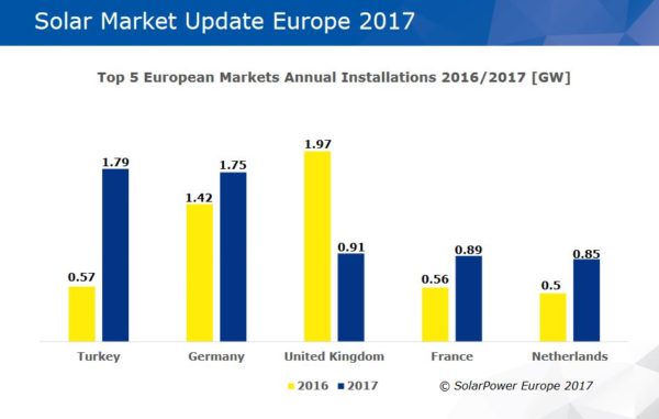 2017年,土耳其的新增太陽(yáng)能光伏裝機(jī)容量為1.79吉瓦,在一年的時(shí)間里,市場(chǎng)增長(zhǎng)率高達(dá)213%。
