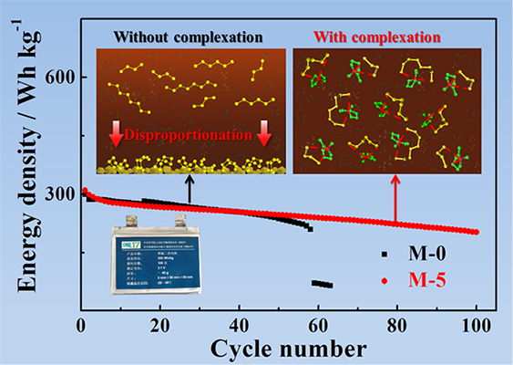 鋰硫電池具有能量密度高、成本低、環(huán)境友好的優(yōu)勢(shì),是國(guó)際儲(chǔ)能領(lǐng)域的研究熱點(diǎn)之一。然而,由于鋰硫電池存在多硫化鋰飛梭、多硫化鋰歧化、電解液分解、金屬鋰枝晶粉化等問(wèn)題,導(dǎo)致其循環(huán)壽命短,尚未滿足大規(guī)模產(chǎn)業(yè)化發(fā)展的要求。該研究團(tuán)隊(duì)針對(duì)多硫化鋰歧化的問(wèn)題,基于“軟硬酸堿理論”,通過(guò)在電解液引入大體積陽(yáng)離子來(lái)絡(luò)合多硫根離子,有效提高了多硫化鋰在電解液中的穩(wěn)定性。采用該電解液組裝的5000mAh鋰硫電池器件的比能量可達(dá)300Wh/kg,且穩(wěn)定循環(huán)100次以上,容量保持率約70%。該工作為提高鋰硫電池的循環(huán)壽命提供了新思路和新策略。
