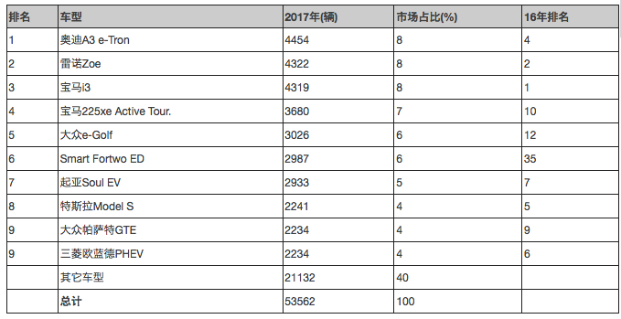 德國市場素以極端穩(wěn)定聞名,但插電式汽車卻走出了與“冰河步伐”完全相反的利基,頻繁的變化讓排行榜單保持著相對的平衡。奧迪A3 e-Tron以4454輛獲得銷售冠軍,但市場份額只占8%,雷諾Zoe排名第二,銷量為4322輛,而2016年的冠軍寶馬i3下滑到第三,僅比第二名少了20輛。