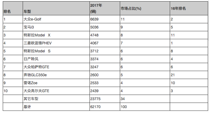 純電動車型包攬了2017年暢銷車前三名,大眾e-Golf繼2015年獲得冠軍后再次問鼎,寶馬i3首次在挪威市場取得第二名,特斯拉Model X在12月份超越了三菱歐藍德PHEV,一舉贏得第三名。