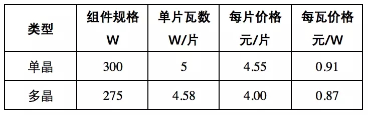 隆基此次價格下調(diào)后,單晶硅片的價格與主流多晶硅片的價差保持在0.5元/片左右。考慮到硅片做成組件后,折算到單瓦的價格已經(jīng)相差不大。以單晶硅片做成60片300W組件,多晶做成60片275W組件為例,兩種組件硅片的成本(不含加工成本)僅相差0.04元/W。如下表所示。