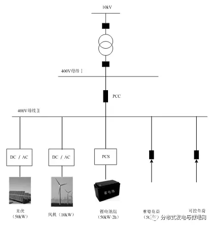 微電網(wǎng)系統(tǒng)由風(fēng)機(jī)、光伏電源、儲(chǔ)能電池、變流器、負(fù)荷、配電網(wǎng)控制系統(tǒng)等組成。發(fā)電側(cè)包含風(fēng)機(jī)、光伏電源、儲(chǔ)能電池等,通過(guò)變流器將微源的輸出轉(zhuǎn)換為滿足并網(wǎng)條件的電能;用電側(cè)根據(jù)負(fù)荷優(yōu)先級(jí)的不同,分為重要負(fù)荷與可控負(fù)荷。