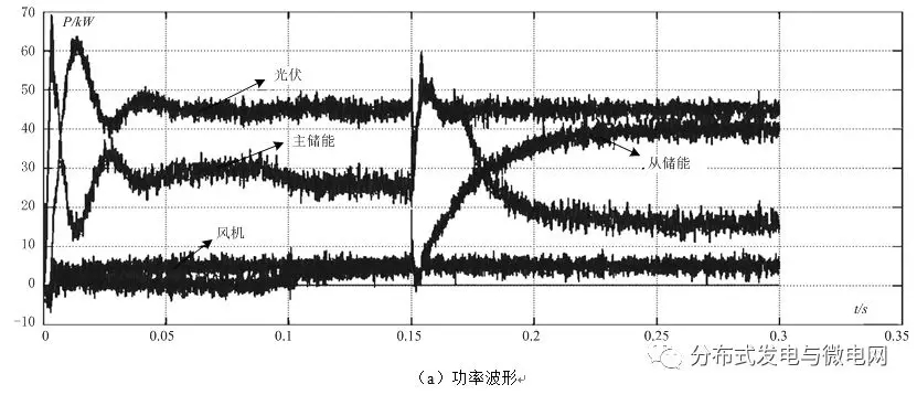 2)0.06s后啟動(dòng)MGCC,從儲(chǔ)能運(yùn)行于PQ控制,按照上層EMS的指令放電(5kW);