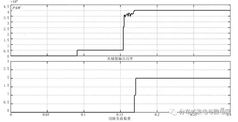 從圖6中可以看出,0.16s突增負(fù)荷后,由于主電源的輸出功率接近額定容量,影響了孤島微電網(wǎng)運(yùn)行的可靠性,因此MGCC采取切負(fù)荷的策略,切負(fù)荷數(shù)量及從儲(chǔ)能的功率支持如圖7所示,從這兩張圖可知,整個(gè)控制過(guò)程較為平穩(wěn),可控負(fù)荷總量少了10kW,從儲(chǔ)能盡可能輸出最大功率以支持主電源,最終保持孤島微電網(wǎng)的穩(wěn)定運(yùn)行。