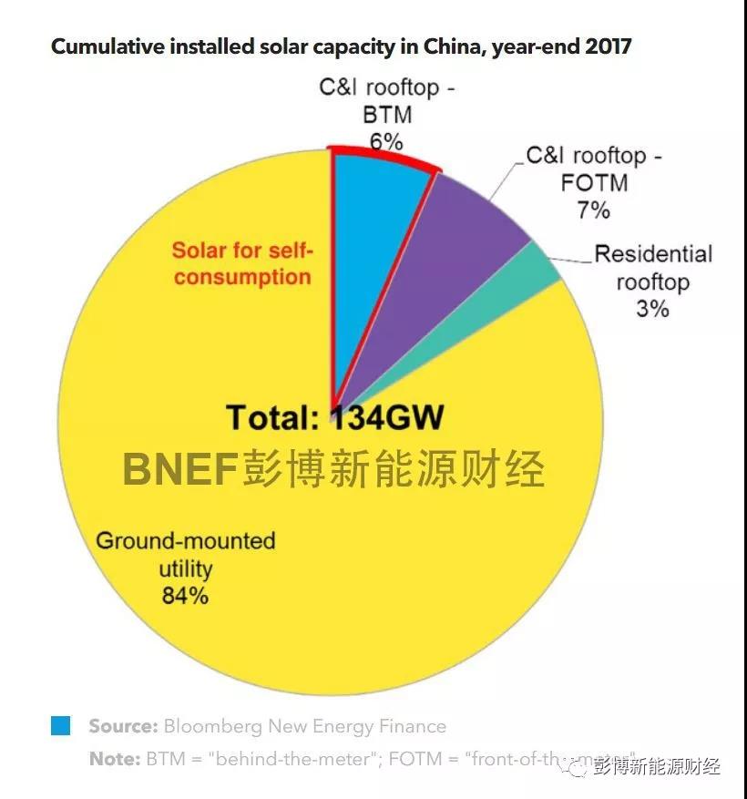 到2017年底,中國大陸光伏裝機(jī)總量達(dá)134GW(BNEF統(tǒng)計口徑),其中屋頂裝機(jī)(含工商業(yè)與居民)達(dá)到21GW,自發(fā)自用工商業(yè)屋頂裝機(jī)達(dá)8GW。