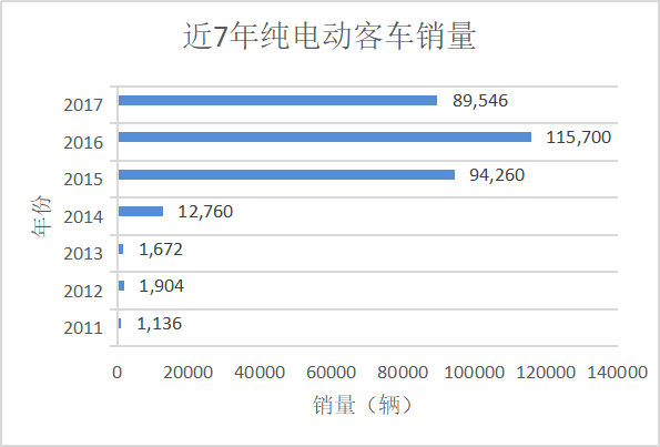 在這種行業(yè)基調(diào)下,純電動客車市場徹底爆發(fā)。從2011年到2016年,純電動客車市場呈現(xiàn)出連增之勢,尤其是2014年和2015年,銷量分別同比增長6.63倍和6.39倍,而年銷量基數(shù)在不到三年內(nèi)從上千輛提高至十萬輛以上,市場火爆程度可見一斑。