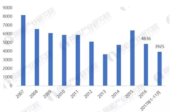 圖表2:2007-2017年全國發(fā)電新增設備容量情況(單位:萬千瓦)