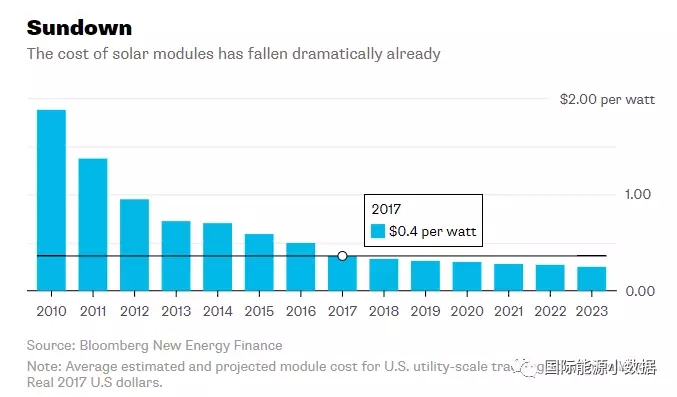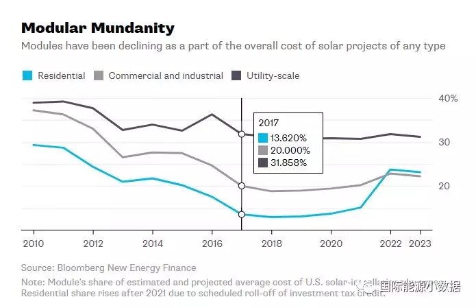 值得注意的是,光伏組件只是光伏系統(tǒng)的一部分。以大型地面光伏電站為例,2010年光伏組件占系統(tǒng)成本的38.8%,而2017年這一比例為31.8%;BNEF預(yù)計(jì)2023年光伏組件將占地面大型光伏電站總成本的31.2%,與2017年相比沒有明顯變化。對(duì)于屋頂光伏而言,2010年光伏組件占系統(tǒng)成本的29.3%,而2017年這一比例跌至13.6%;BNEF預(yù)計(jì)2023年光伏組件將占屋頂光伏總成本的的23.2%。