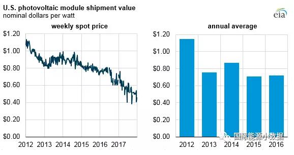 中國儲(chǔ)能網(wǎng)訊:根據(jù)美國能源署(EIA)統(tǒng)計(jì)的數(shù)據(jù),2012年美國的光伏組件平均成本1.15美元/Wdc(約合人民幣7.31元/瓦),到2016年平均成本為0.72美元/Wdc(約合4.58元/瓦)。