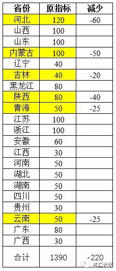 黃色區(qū)域包含河北等6省,按照50%的量條件,之前發(fā)放的2018年13.9GW的光伏電站指標(biāo)將縮減2.2GW至11.7GW,具體如下表所示。
