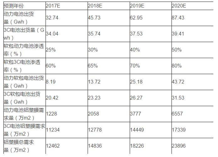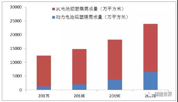 國內(nèi)軟包電池鋁塑膜總需求在2017年約為1.25億平方米,到2020年有望達(dá)到2.39億平方米,由于3C電池單位電池容量鋁塑膜用量顯著高于動(dòng)力電池,故3C電池需求處于較為主導(dǎo)的地位。