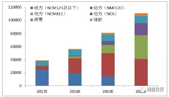 國內(nèi)三元材料的總需求量在2017年約為3.9萬噸,到2020年有望達(dá)到11.1萬噸,復(fù)合增長率為41.72%。其中,動(dòng)力電池需求市場始終占據(jù)主導(dǎo)地位,且高鎳替代低鎳趨勢明顯。