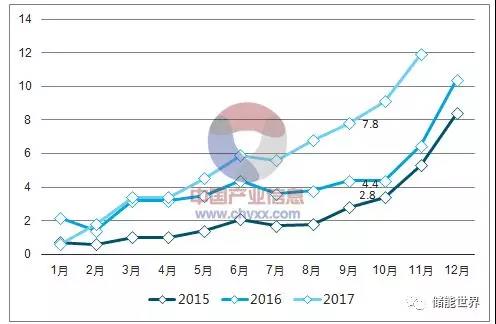 2015年-2017年新能源汽車單月銷售數(shù)據(jù),可以看出2017年除1月受補(bǔ)貼退坡政策影響,銷量較前兩年偏低外,其他月份單月銷量均超過往年水平,且差距逐步拉大,到11月,單月銷量數(shù)據(jù)分別超出2016年和2015年5.4萬輛和6.6萬輛。新能源汽車市場回暖態(tài)勢基本符合在2017年年中的預(yù)期,預(yù)測2017年全年新能源汽車銷量將大概率突破75。