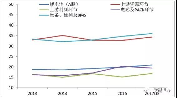 2017年三季報(bào)顯示,毛利率最高的是設(shè)備、檢測及BMS環(huán)節(jié)以及上游資源環(huán)節(jié),而毛利率始終處于劣勢的為上游材料及電池環(huán)節(jié),考慮這是由于材料環(huán)節(jié)在上游資源的強(qiáng)勢格局及下游車企在退補(bǔ)中的降本訴求對中游環(huán)節(jié)產(chǎn)生了雙重壓迫導(dǎo)致。