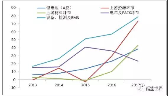 細(xì)分子行業(yè)方面,設(shè)備環(huán)節(jié)、上游材料環(huán)節(jié)與行業(yè)整體基本保持同一收入增長趨勢,上游資源及電芯環(huán)節(jié)的收入增速和凈利潤增速趨勢則背道而馳,這是因?yàn)榻?jīng)歷了2015年以來新能源汽車行業(yè)的爆發(fā)式增長后,鋰、鈷等上游資源已明顯呈現(xiàn)供不應(yīng)求的格局,這一點(diǎn)在上游資源價(jià)格的瘋漲上也有所體現(xiàn),相關(guān)公司業(yè)績與股價(jià)齊漲。
