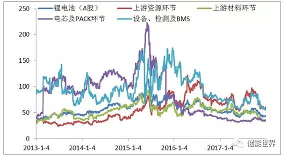 鋰電池行業(yè)及其細(xì)分子行業(yè)近五年的估值變化情況(已剔除負(fù)值),可見自2015年新能源汽車爆發(fā)式發(fā)展,帶動(dòng)鋰電池行業(yè)一路猛漲之后,鋰電池行業(yè)整體經(jīng)歷了2016和2017年兩年的緩慢回調(diào),目前估值已基本回歸2013-2014年水平。