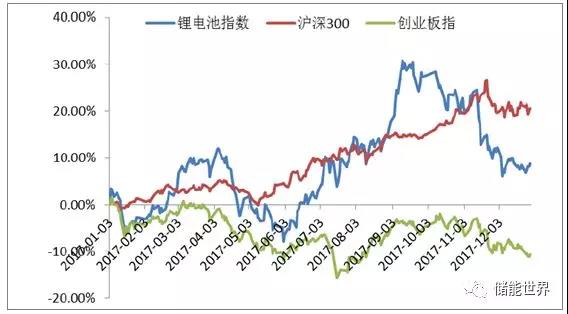 2017年全年,鋰電池指數(shù)累計(jì)上漲8.88%,跑輸滬深300指數(shù)11.72個(gè)百分點(diǎn),跑贏創(chuàng)業(yè)板指19.61個(gè)百分點(diǎn)。