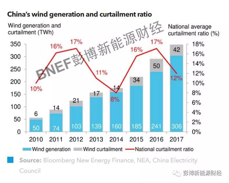 2017年,中國風(fēng)電限電情況顯著改善,限電總量下降至42TWh,較2016年峰值減少8TWh。中國風(fēng)電容量的平均限電率從2016年的17%下降至12%,全國平均發(fā)電系數(shù)則從2016年的20%提高至22%。