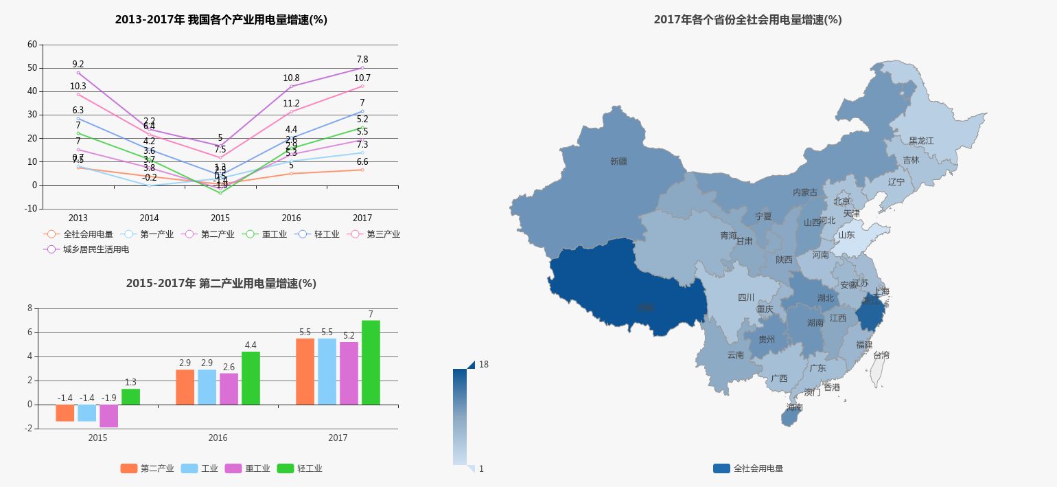 從全社會(huì)用電量增速上看,2017年,我國(guó)各個(gè)省(自治區(qū)、直轄市)全社會(huì)用電量已經(jīng)出現(xiàn)全面增長(zhǎng)的局面。