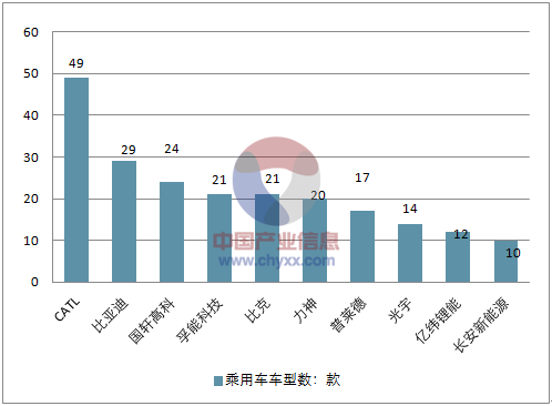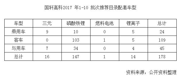 2017 年前10 批目錄中共有146 家不同的電池供應(yīng)商匹配了2949 款車型,其中前十大電池廠商匹配了1860 款,占比68%,行業(yè)集中度高。龍頭CATL 共配套了 585 款車型,排名第一;堅瑞沃能、國安盟固利和國軒高科分居第事、三、四位,各配套了192 款、186 款和178 款車型。在乘用車方面,前三名CATL、比亞迪和國軒高科分別配套了49 款、29 款和24 款車型,較多的乘用車配套車型數(shù)將為公司動力電池組的銷量帶來保障。