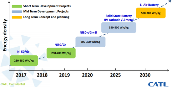不僅在量產(chǎn)指標(biāo)上一較高下,下一代高性能電池角力過(guò)程也不落下風(fēng)。目前三星SDI、松下等動(dòng)力電池能量密度(實(shí)驗(yàn)室產(chǎn)品狀態(tài))在250Wh/kg左右,而憑借輕量化、電芯原材料機(jī)理改善、BMS優(yōu)化等多種技術(shù)手段的協(xié)同,寧德時(shí)代也取得了同樣的研發(fā)成績(jī)。而為了贏(yíng)得2025年的市場(chǎng)競(jìng)爭(zhēng),寧德時(shí)代已經(jīng)開(kāi)展了下一代高性能電池技術(shù)開(kāi)發(fā),研發(fā)以高鎳三元材料為正極、硅碳復(fù)合物為負(fù)極的鋰離子動(dòng)力電池,可將比能量大幅提高至300Wh/kg以上,成本也將顯著降低。