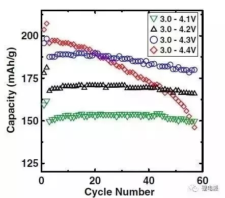 由圖中可以看出,在較高截止電壓條件下,活物質克容量、電池容量都高,但是電池容量和材料的克容量衰減地也更快。反而是較低的截止電壓(4.2V以下)下,電池容量衰減緩慢,循環(huán)壽命更長。