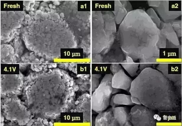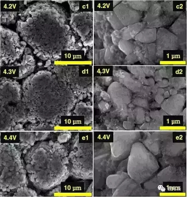 a1 a2為未經(jīng)過循環(huán)的電池SEM圖片。b~e分別為在0.5C條件下、充電截止電壓為4.1V/4.2V/4.3V/4.4V,循環(huán)200cycle后正極活物質的SEM圖像,其中左側為低倍率下,右側為高倍率下電鏡圖片。由上圖可以看出,循環(huán)后的電池與未循環(huán)的電池在顆粒形貌、破碎程度上并沒有特別大的區(qū)別。