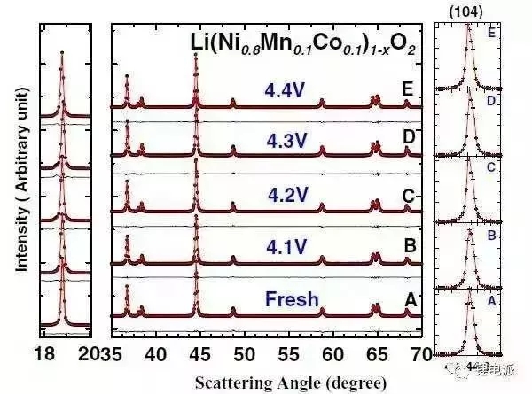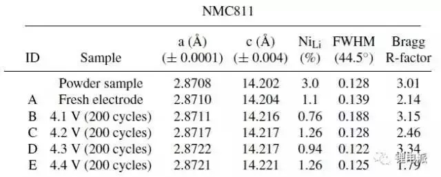 1.未循環(huán)的極片晶格常數(shù)和NCM811活物質粉末的晶格常數(shù)是一致的。循環(huán)截止電壓是4.1V時,其晶格常數(shù)也與前兩者無明顯區(qū)別,c軸有少量增加。再看循環(huán)截止電壓為4.2V、4.3V、4.4V的c軸晶格常數(shù),與4.1V的無明顯區(qū)別(差異為0.004埃),而在a軸上的數(shù)據(jù)就差異比較大了。