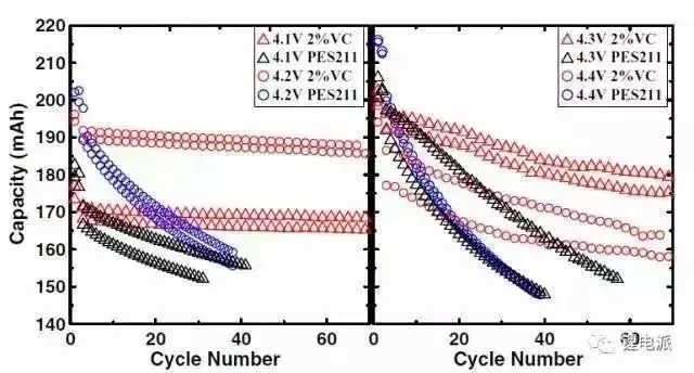 可以看出,在低截止電壓下循環(huán),電池△V較小,而電壓升高到4.3V以上時,△V急劇升高,電池極化加重,這就大大影響了電池的壽命。從圖中也可以看出,VC和PES211的△V變化速率是不同的,這進一步驗證了電解液添加劑不同,電池極化程度、速度也是不同的。