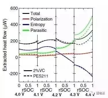 圖中顯示在4.2V電壓之上,寄生熱流突然升高,這是因為在高電壓下高度脫鋰的正極表面極易與電解液發(fā)生反應。這也解釋了為什么充放電電壓越高電池容量維持率下降越快。