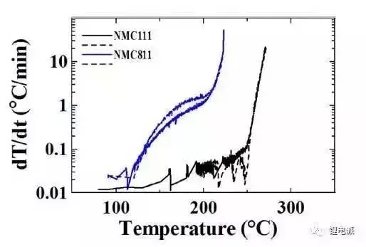 該圖是NCM811和NCM111在70℃-350℃之間自加熱速率的曲線圖。圖中顯示在105℃左右,NCM811開始發(fā)熱,而NCM111還沒有,一直到200℃時才開始出現(xiàn)了發(fā)熱。NCM811在從200℃開始,發(fā)熱速率為1℃/min,而NCM111還是0.05℃/min,這也意味著NCM811/石墨體系的電池較難通過強制安全認證。
