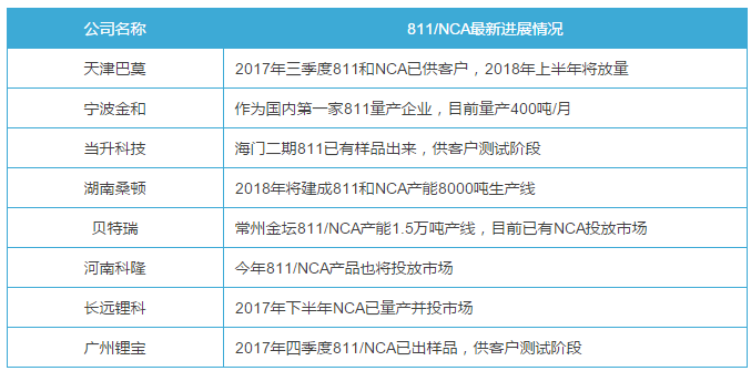 此外,廈門鎢業(yè)、優(yōu)美科等主流廠家紛紛進(jìn)行811/NCA產(chǎn)品的技術(shù)儲(chǔ)備,在不遠(yuǎn)的將來,也將有產(chǎn)品面市。